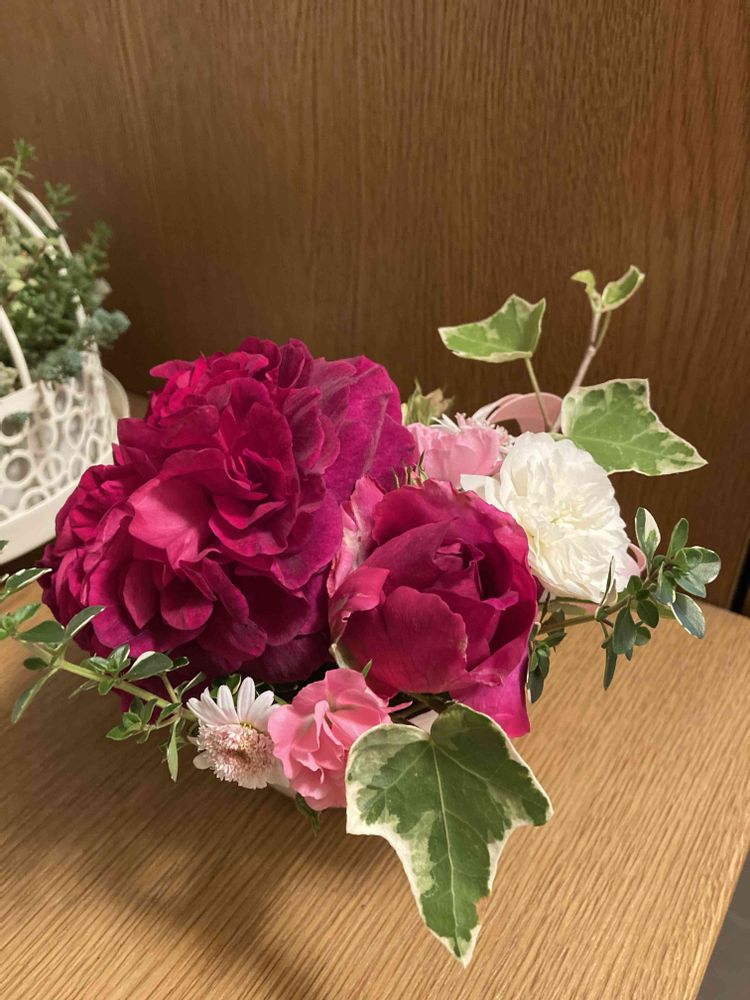 それぞれ好きなバラや小花、リーフを選んで小さなアレンジメントを作りました🌹🌸🌿