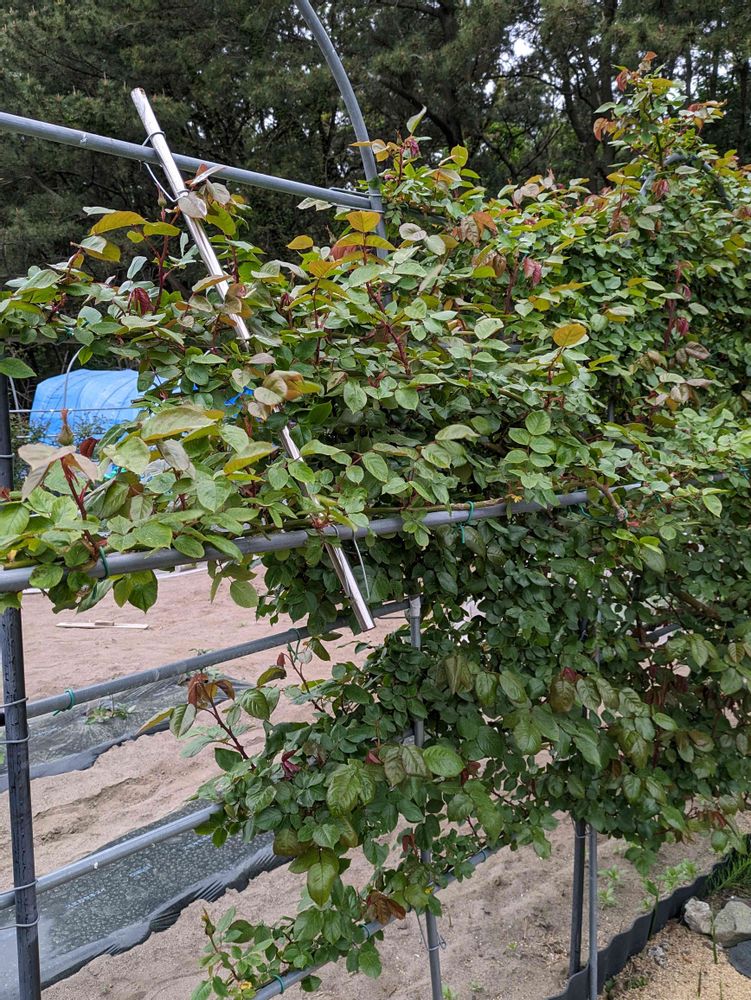 ちょっと判りにくいけど、アンクルウォルターの枝が支柱の前と後ろにあって混み過ぎなので裏側に横棒足して斜めも足して、裏側の長い枝を誘引し直しました😃これで風とおし良くなったハズ😁