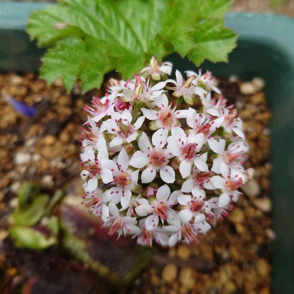 小さな花が集まり、まん丸な固まりが可愛い〜後から大きな葉っぱ(45cmくらいにもなる)が出てくるユキノシタ科の植物