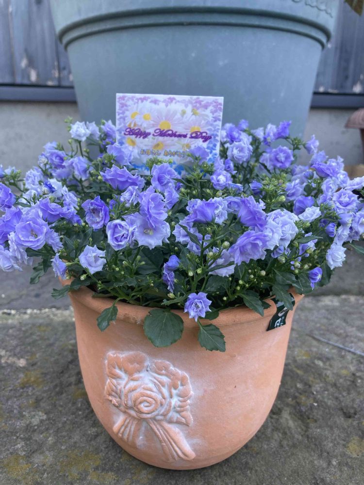 カンパニュラ色合い、花の形もかわいい😍ですよね♪ 初めてなので、これから夏越しが心配です♪ 鉢もありがとうございます💕