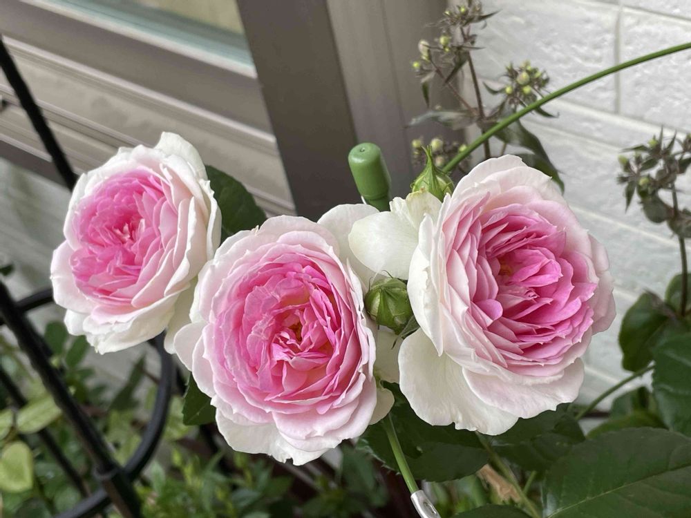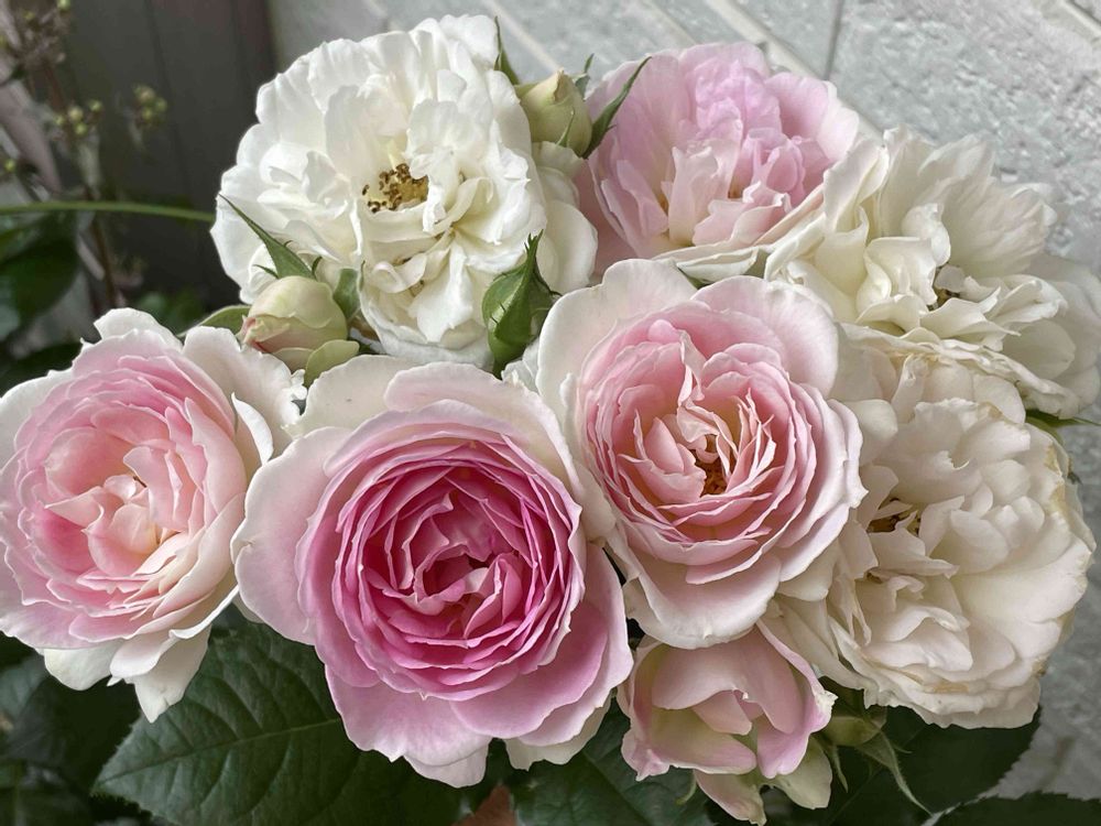 一房でまるで花束のようです 退色すると🩷が薄くなってやがて白に いくつかの薔薇組み合わせた様に見えます