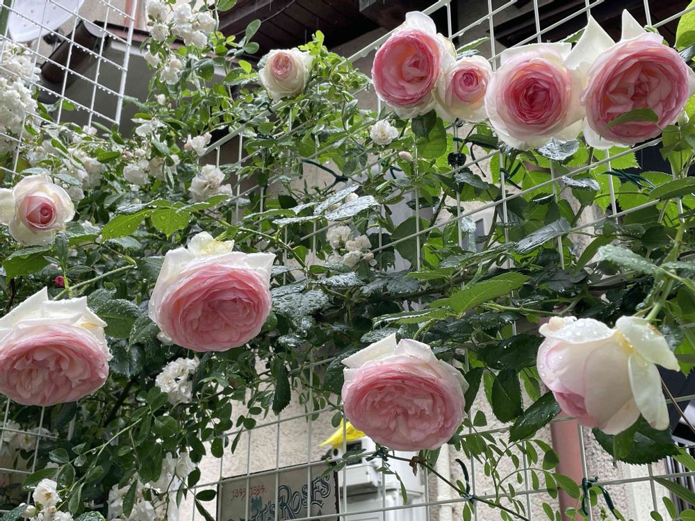 🌹満開を迎え 大きなピエールさん達は ⤵︎を向いて 雨の雫を避けています