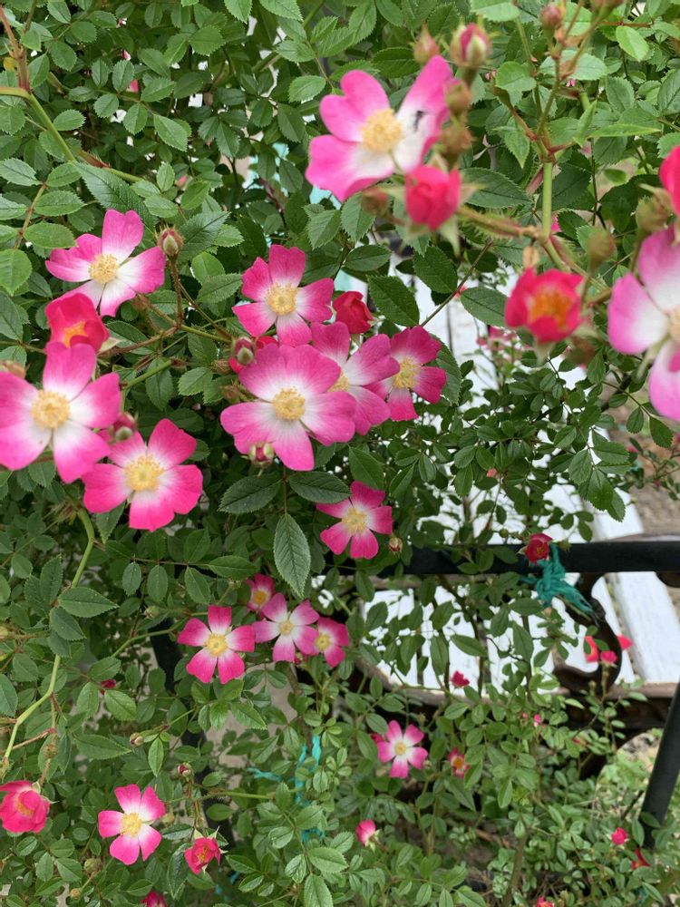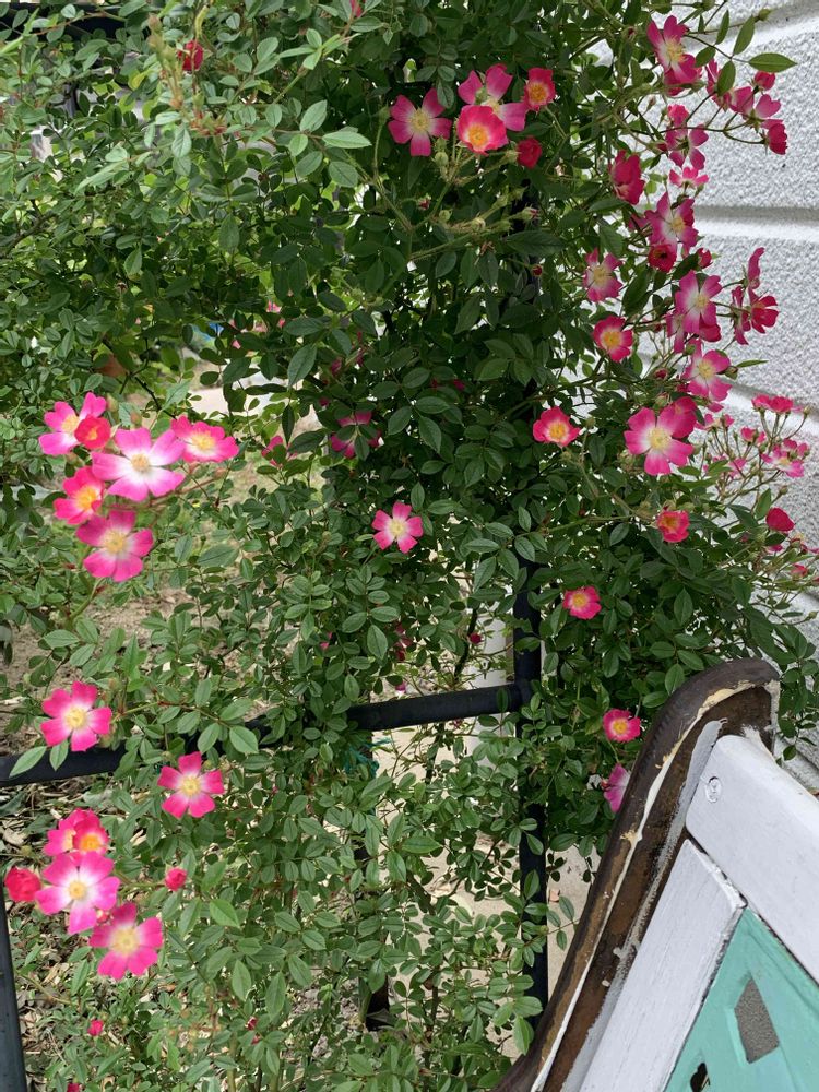 我が家のツル薔薇🌹モーツァルトさんです🌹お迎えした時は10センチもないチビ苗でしたがグングン成長中で、今、いっぱい咲き始めました🌹モーツァルトさんLOVE🎹❤️