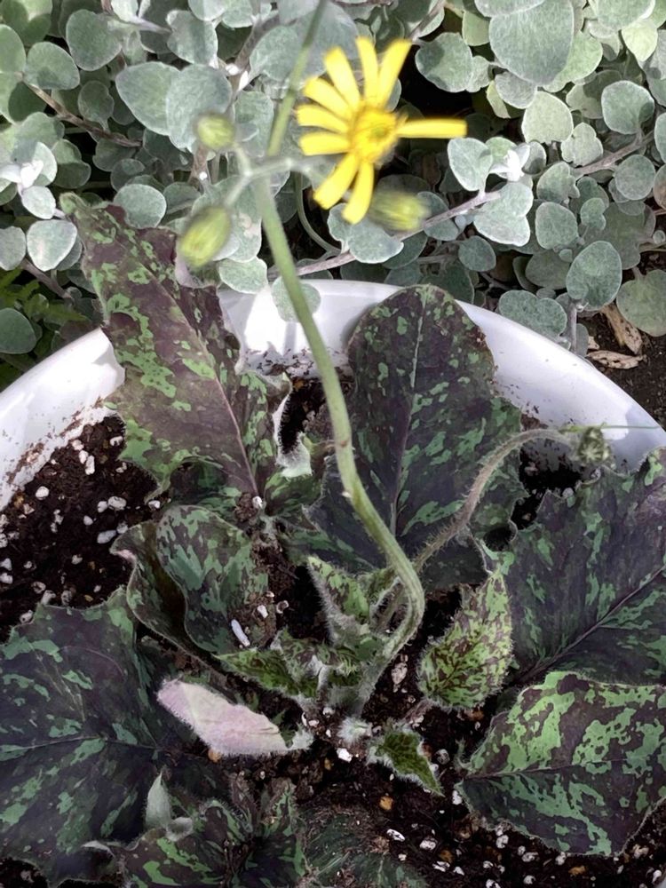 こんな変わった葉っぱ、見たことありますか⁉️ちょっとわかりづらいかしら?ウズラの卵の模様に似ているからウズラバタンポポと言うそうです。花友さんが送ってくれました。長く伸びた花茎が折れないよう大切に梱包してもらってやって来て、明日にも咲くのかと思ったら、なかなか咲かず…このまま萎れてしまったらどうしようと心配になったところで、やっと咲いてくれました。長旅で疲れて、まだ眠そうですね。
