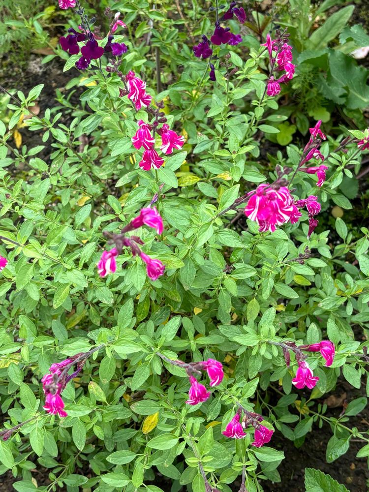 チェリーセージ、我が家は4種類植えてありますが、お気に入りのマーブル模様が可愛いマーブルベリーと素敵な色合いのナイトモスの挿し芽苗を空いたスペースに並べて植えてみた2年めの今。