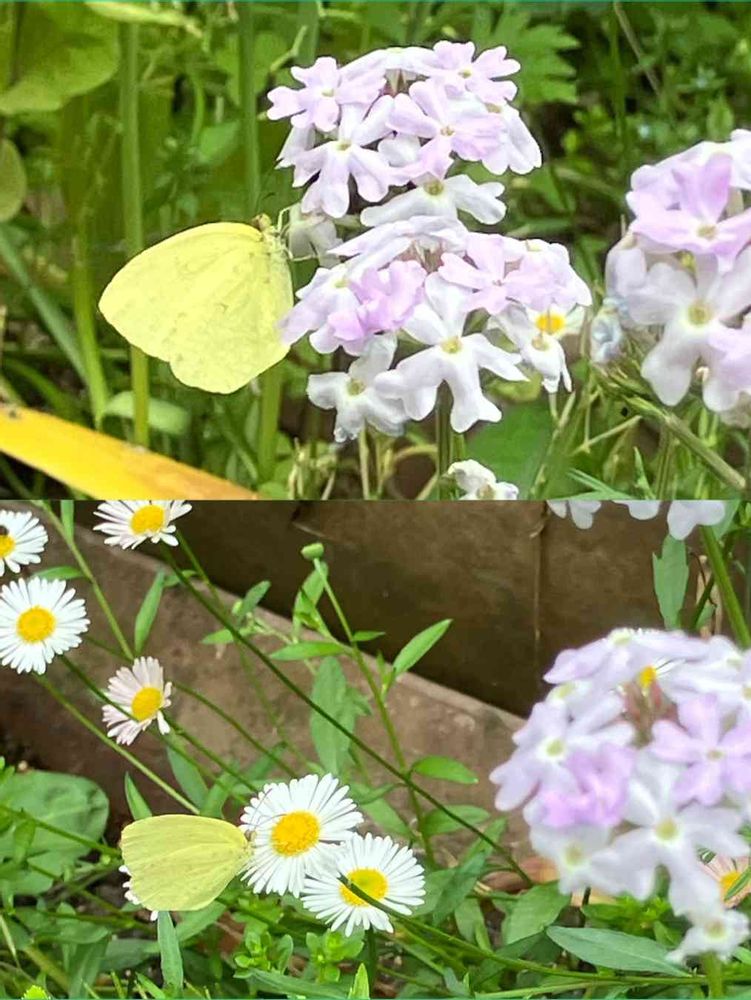 ⑤溢れ種から育ったバーベナを🤳していたら黄色の蝶々がやって来て暫く止まってたので🤳出来ました