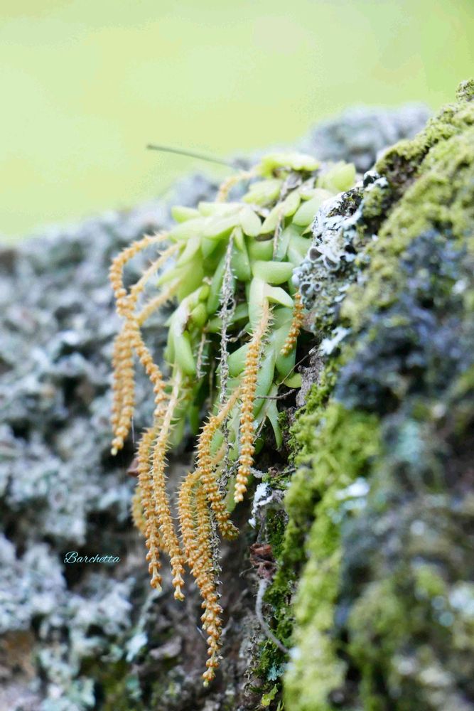 この蘭はいつもぶら下がってる感じですね。しかも大きな株は私は見たこと無いです。何故か?調べたら大きくなるのは稀だそうで個体を維持し続けるのじゃなくて有生生殖で世代交代しながら明るい場所に移動していく繁殖戦略をとっているんだからだそうです。世代交代出来ないうちに落下しちゃったのかも知れませんね。