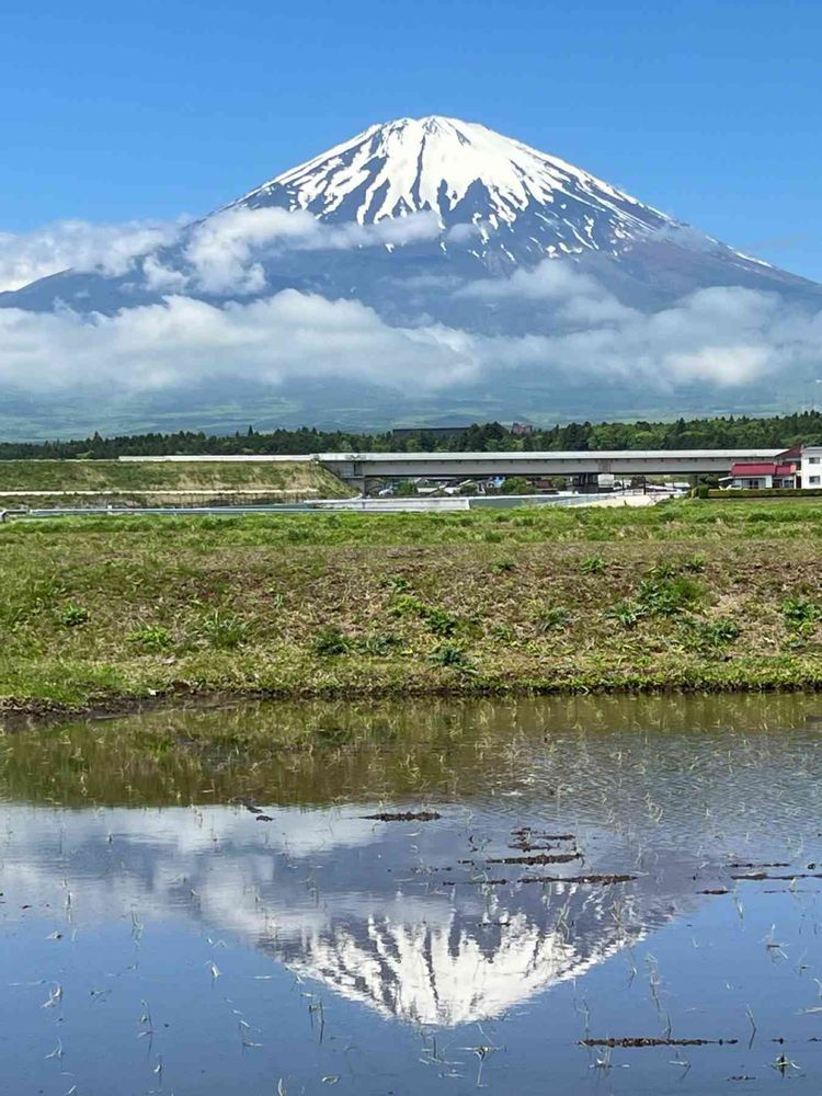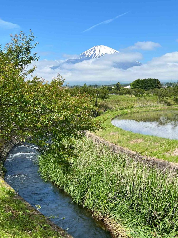 富士山の湧き水の川,川に囲まれた田んぼ,神社の鳥居から見た富士山の投稿画像