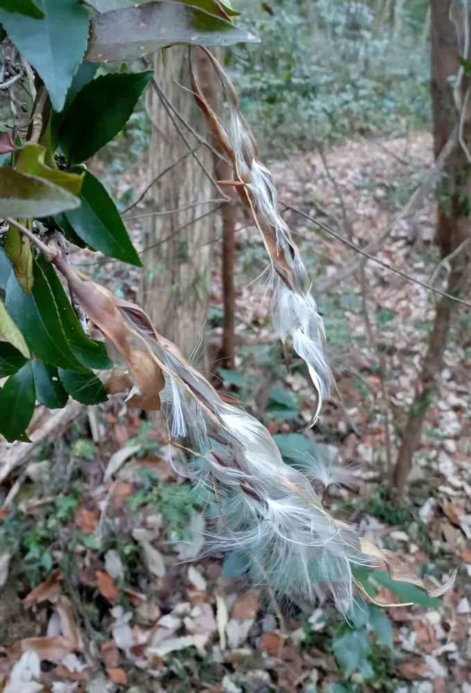 キョウチクトウ科テイカカズラ属の常緑つる性木本。低地の林内に生え、植栽もされる。太いつるは径10㎝を超す。つるははじめ地を這い小さな葉をつけるが、茎から多数の付着根を出して木や岩によじ登り高みに育つと、葉は大型化して花が咲く。花期は5~6月。杯形の花は5裂してプロペラ状にねじれ、ジャスミンに似た強い芳香で蛾を誘う。はじめは白く、後に淡黄色に変化する。1個の花から長さ約20㎝の袋果(たいか💬袋状になった果実)が一対実る。袋果はささげのように細長く垂れ、冬に裂けると白く輝く種髪とよばれる長い絹糸のような毛をつけた種子がふわふわと風に舞い遠くまで飛ばされる。小さめの葉をつけ、新葉にピンクと白の斑が入る園芸品種『ハツユキカズラ』もある。