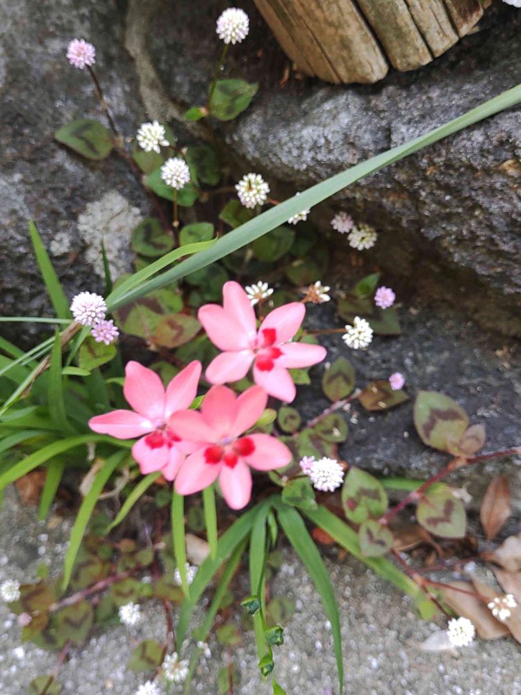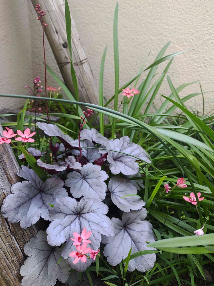 ヒメオウギの下に咲いているまんまるちゃんもかわいいですね。まんまるちゃんがヒメオウギを引き立て、ヒメオウギはヒューケラ を引き立て、すてき💕
