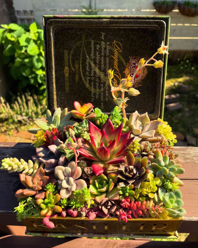 頂いた空き缶に寄せ植えしました