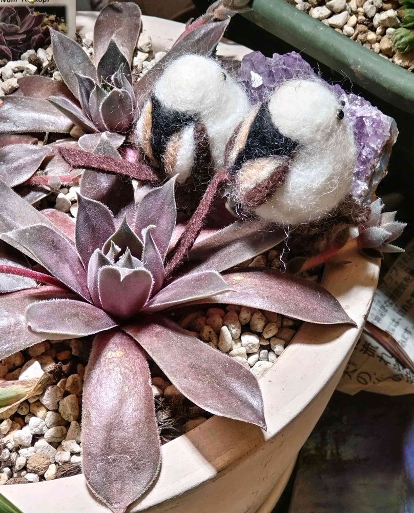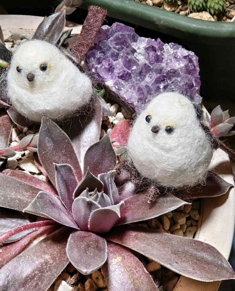 羊毛フェルトのシマエナガ、前回よりも小さく作りましたよ🕊クチバシを樹脂粘土にして、脚をワイヤーに刺繍糸を巻いて爪も樹脂粘土をチビっとつけてみたけど雑です😥