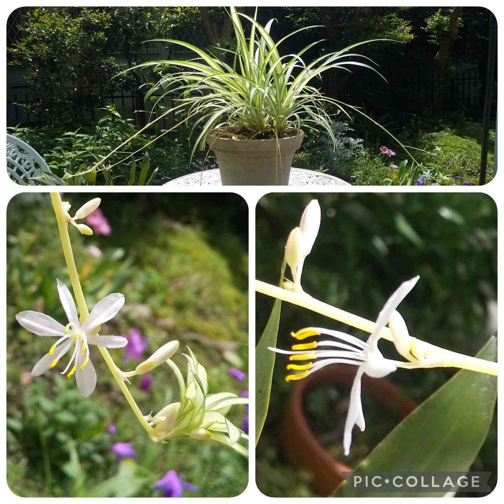 一冬預かった斑入りオリヅルランがすっかり元気になり、子株を8割がた切ったら、新たなランナーが出てきて花を咲かせました。
