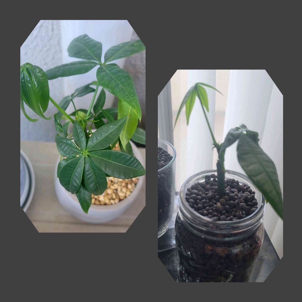我が家にも例のDAISO二本パキラがいるんですが、先月それぞれ用土とハイドロに分けて植え替えしました