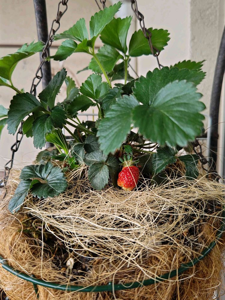 2枚め、我が家のいちご。やっとひとつ赤くなった〜🍓。