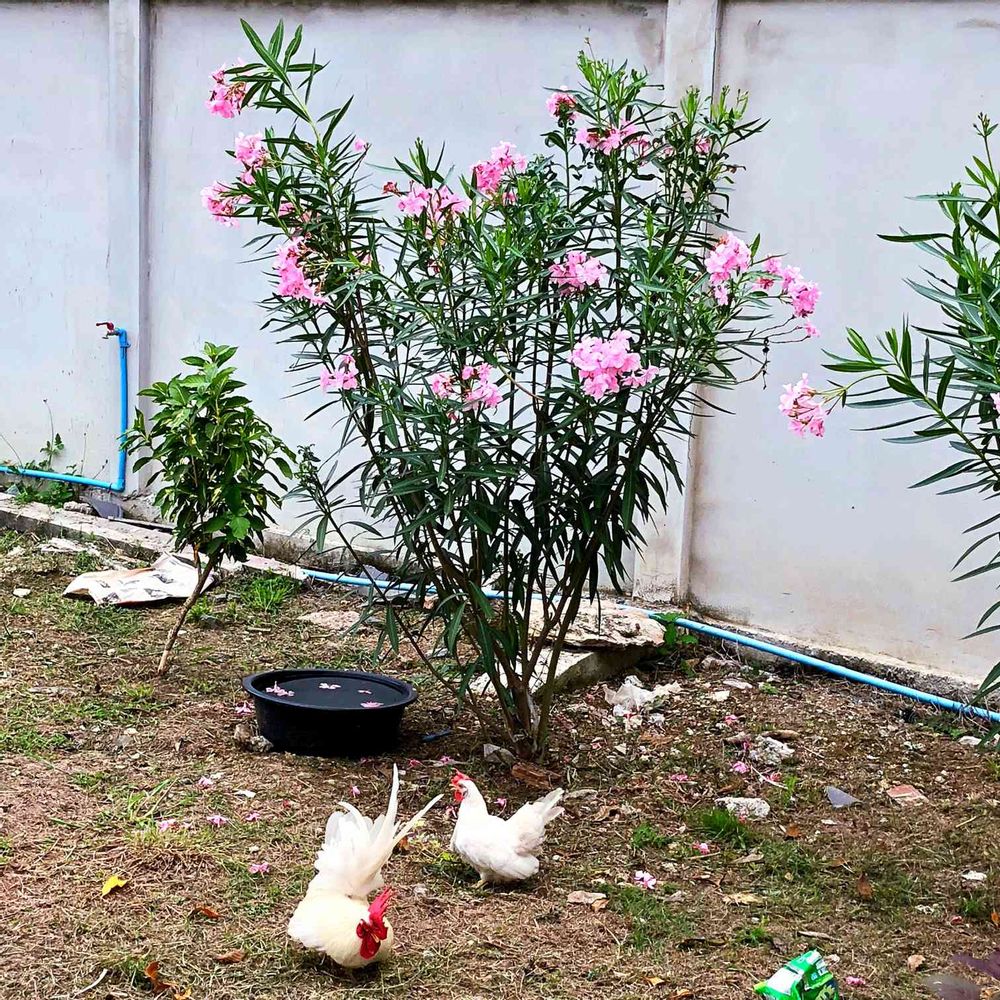 庭には色々な木が植えてありますが、なぜかバンタム夫婦はキョウチクトウの木の周りにしか遊びに来てません😅😅😅でも本当に気をつけないといけないですね😌〜バンタム夫婦のためにも🐔❤️🐔本当にありがとうございます😊🙏💕