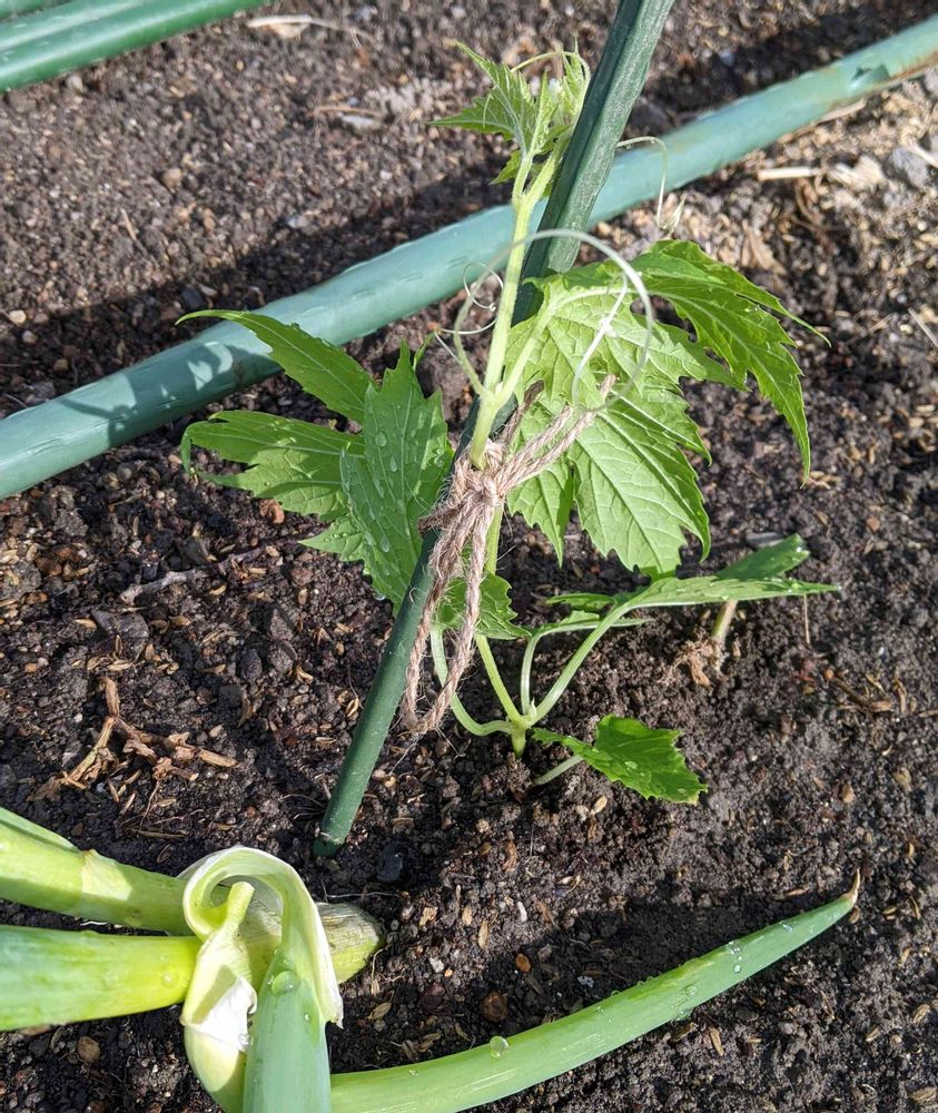 白ゴーヤをネギと一緒に定植しました。ネギはゴーヤを病気から守ってくれるそうです。