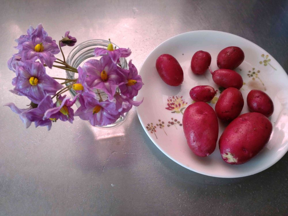 赤紫の花のじゃがいもは、さつまいものような色でした。