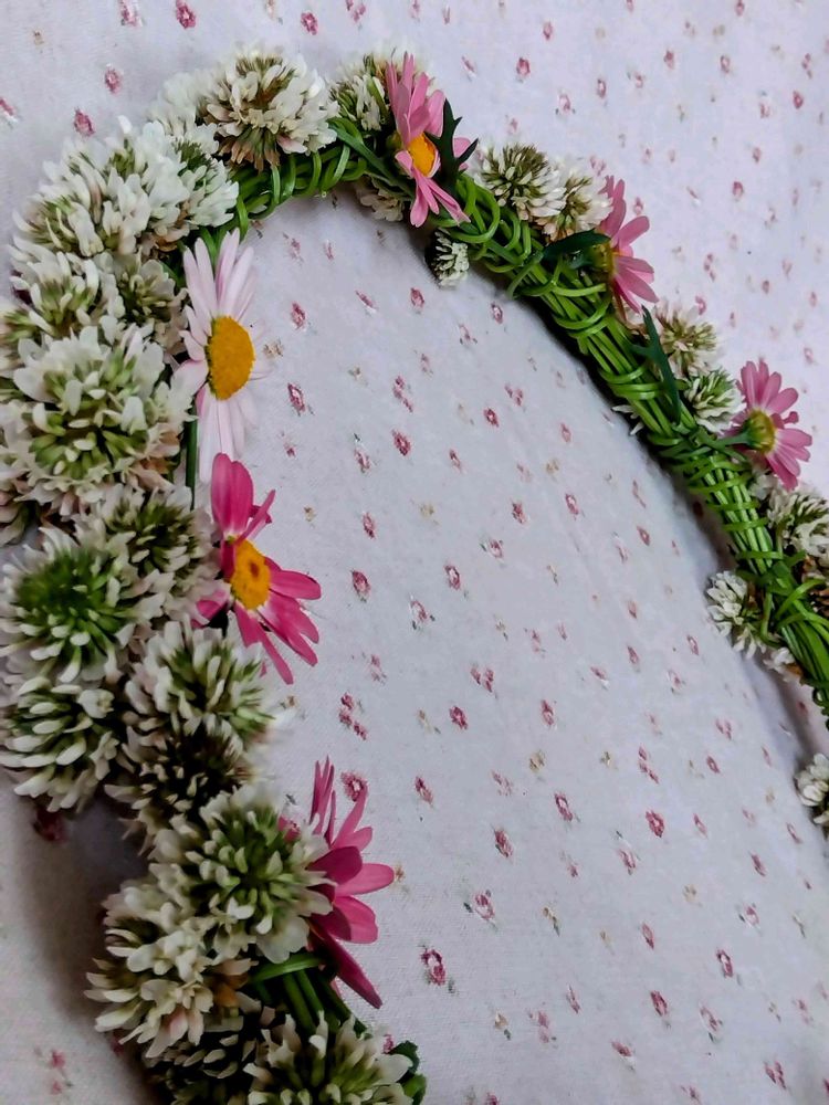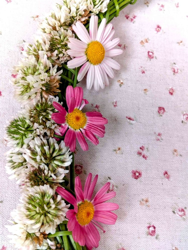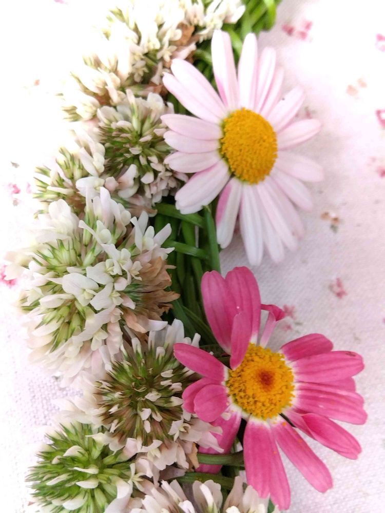 今朝の散歩で、私だけのパワースポットのシロツメクサを摘み、我が家のマーガレット・ストロベリーホイップをちょいと足して、花の首飾りを作ってみました🤗