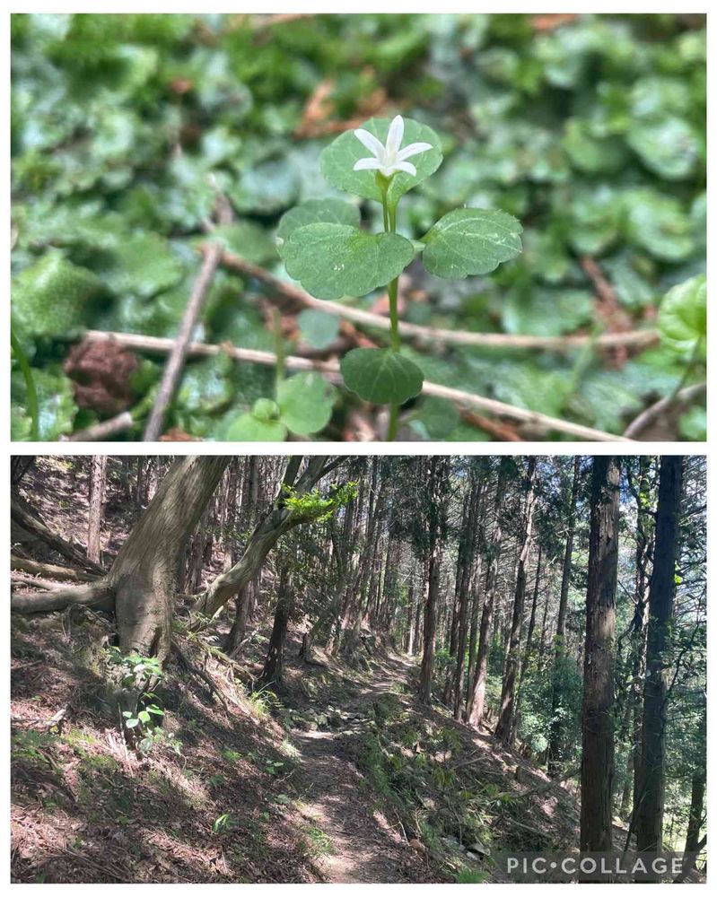 登山口に向かうこちらは近畿自然遊歩道。ちょろちょろと水が流れる湿気の多い場所で見つけた小さな可愛い白いお花は何でしょうか…🧐