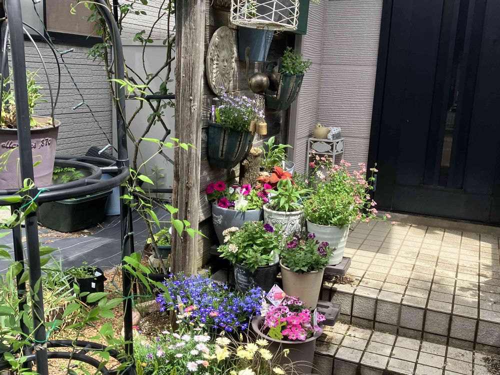 玄関先もビオラからペチュニアやエキナセア等に変更したよ。