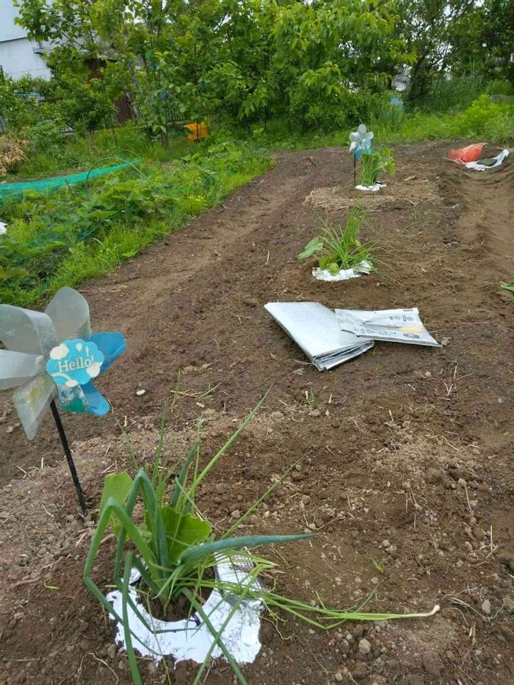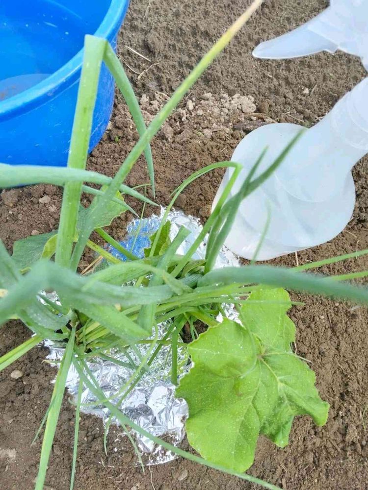 ①種からのカボチャの苗が大きくなりウリハムシ対策していた網を取りウリハムシの嫌う光を利用して銀のシートを置いた