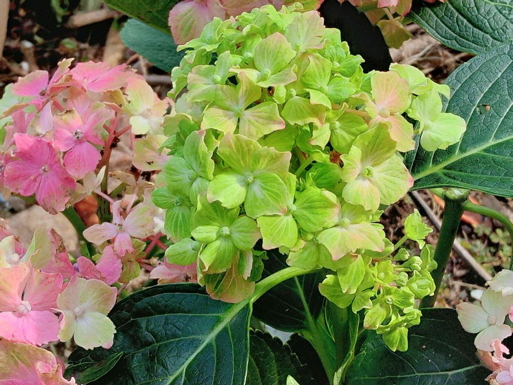 紫陽花、グリートとピンクの色がでて