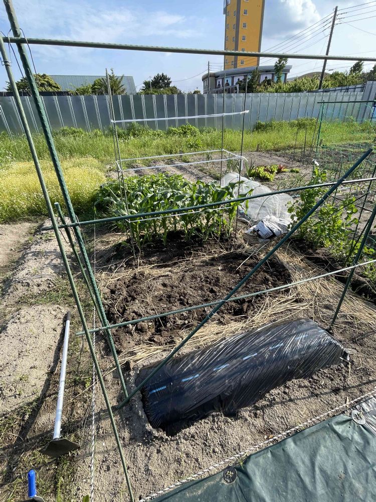 手前の黒マルチには昨年上手く育ったサツマイモ🍠の立体仕立て予定😊