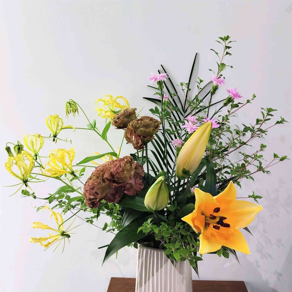 今週の花材は、ユリ、グロリオサ、トルコキキョウ、スプレーカーネーション、ドウダンツツジ、ドラセナ です✨