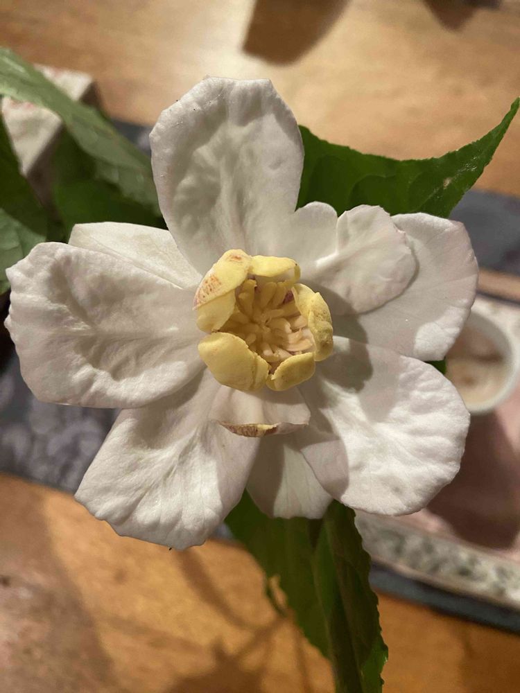 ①門の影で人目につかない夏ロウバイひと枝リビングでみんなにご挨拶