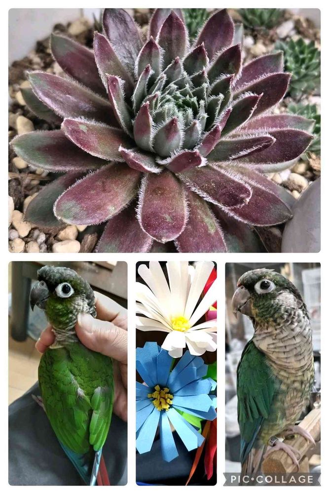 ①Loyal Opera(ロイヤル・オペラ)と、ウロコインコのわさび(左下)、ナギ(右下)、そして折り紙の花(真ん中下)