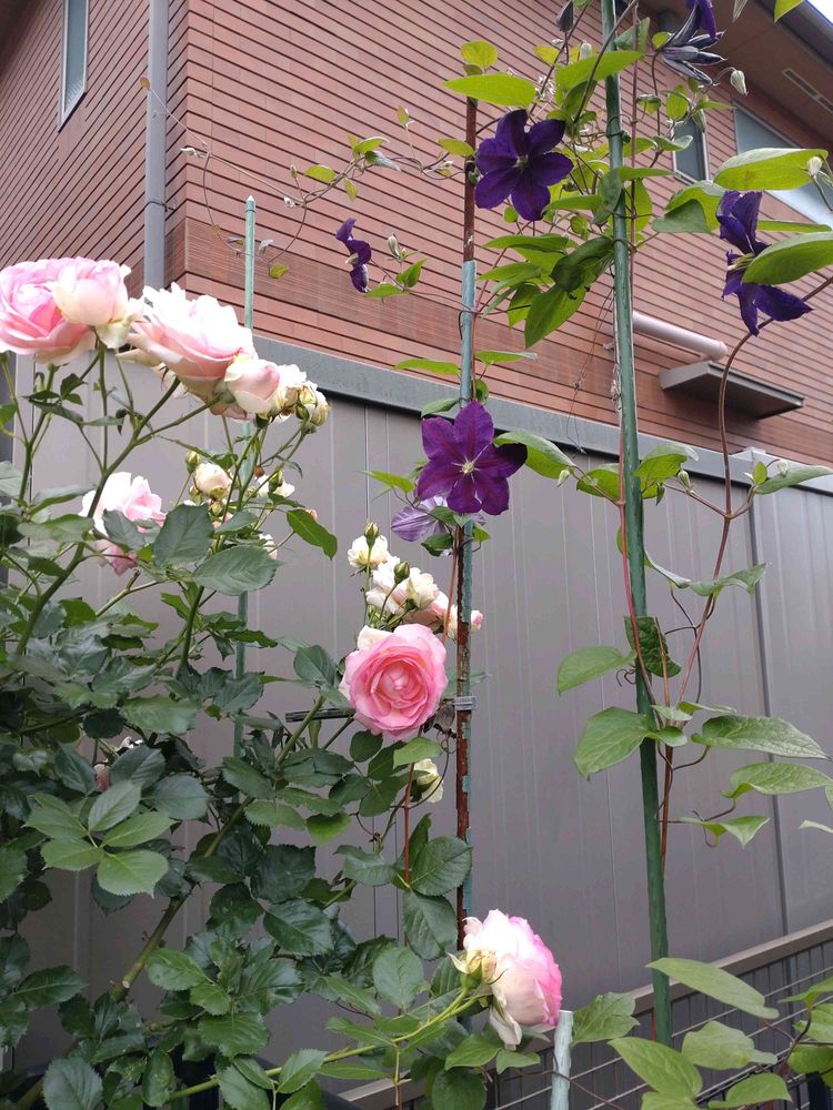 辛うじて隣にいるコラボだね。バラの上に誘引できればいいけど、バラが大きくて、誘引できず。