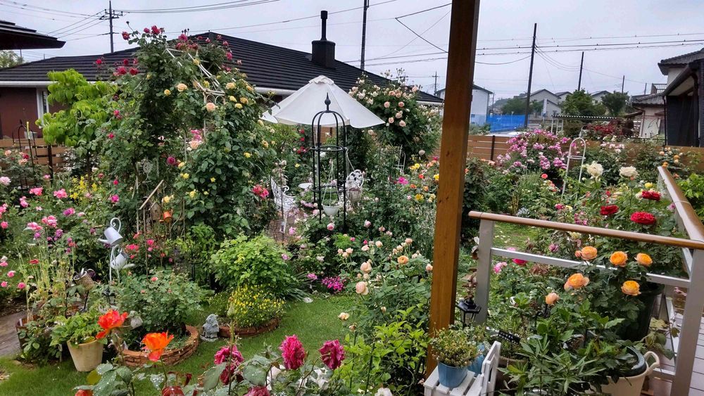 パラソル&テーブルのあるバラ庭憧れます💓💓