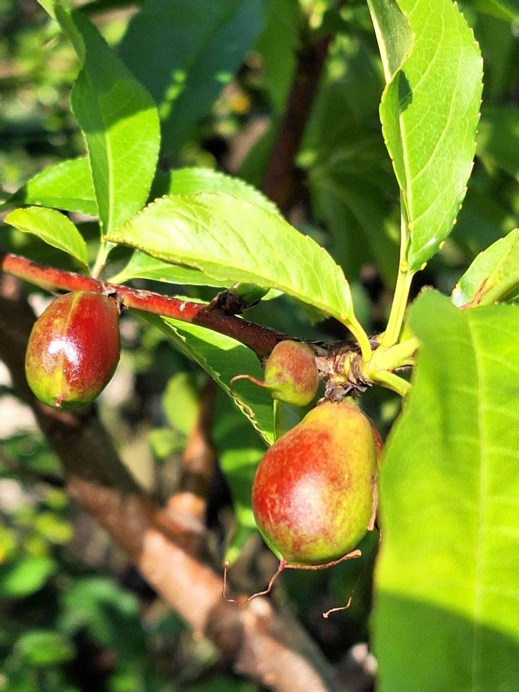 梨、こんなふうに実ができるんですね(下向きに実ができると思ってました😣)。摘果、どの実を残すか迷いますね🤭