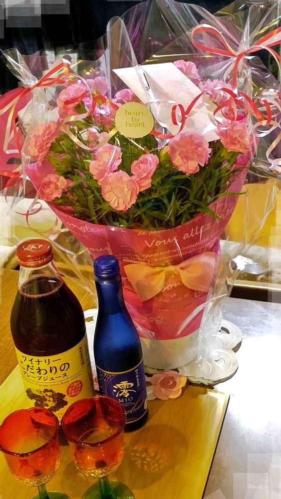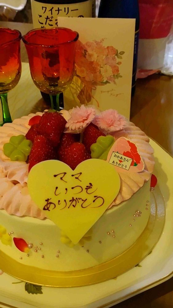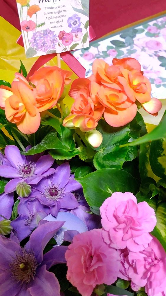 先日の母の日に、息子からプレゼントしてもらった寄せ花💐と、主人からもらったカーネーションとケーキ〜💖