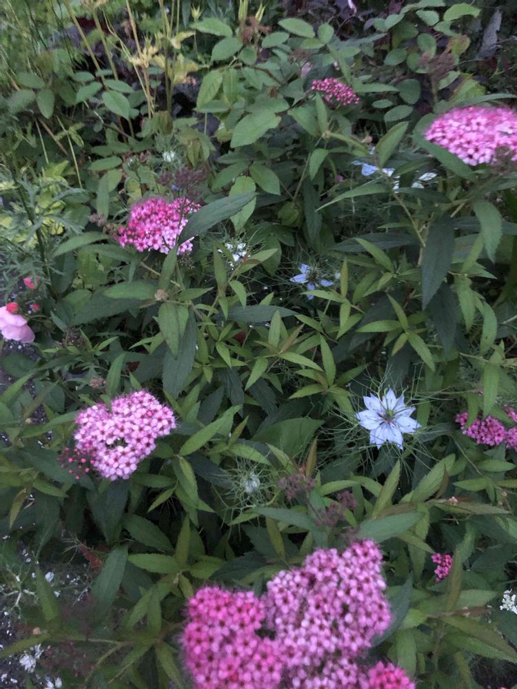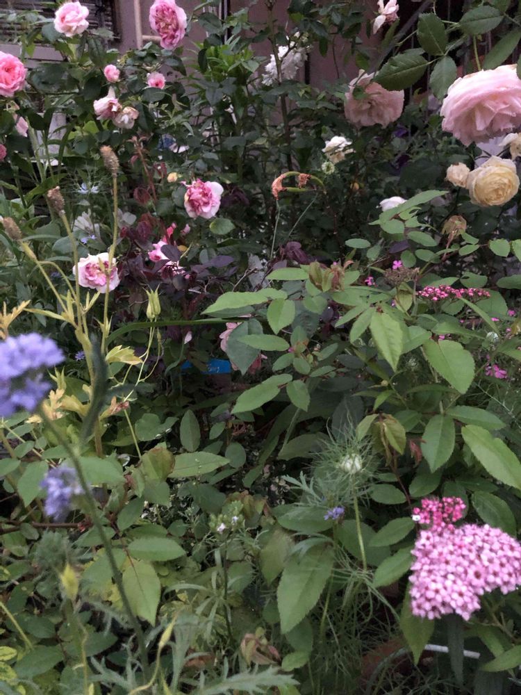 ラナンキュラスラックスが終わって薔薇が咲いてきた🌹同時に咲いてくれたら嬉しいのにな🌸今年は薔薇が咲くの少し遅かった気がする💐薔薇の手前にはシモツケとこぼれ種のニゲラ、ギリア
