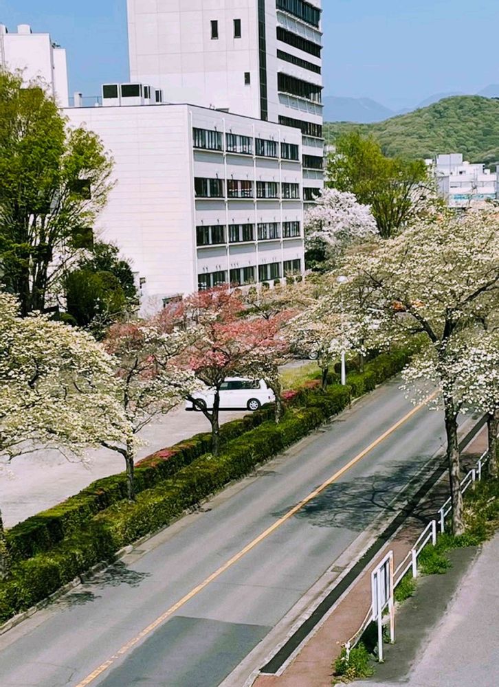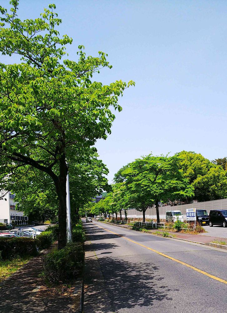 同じ通りの左側から見た新緑の木々と💚4月15日の右側から見た花が綺麗な木々❀🌸🌳