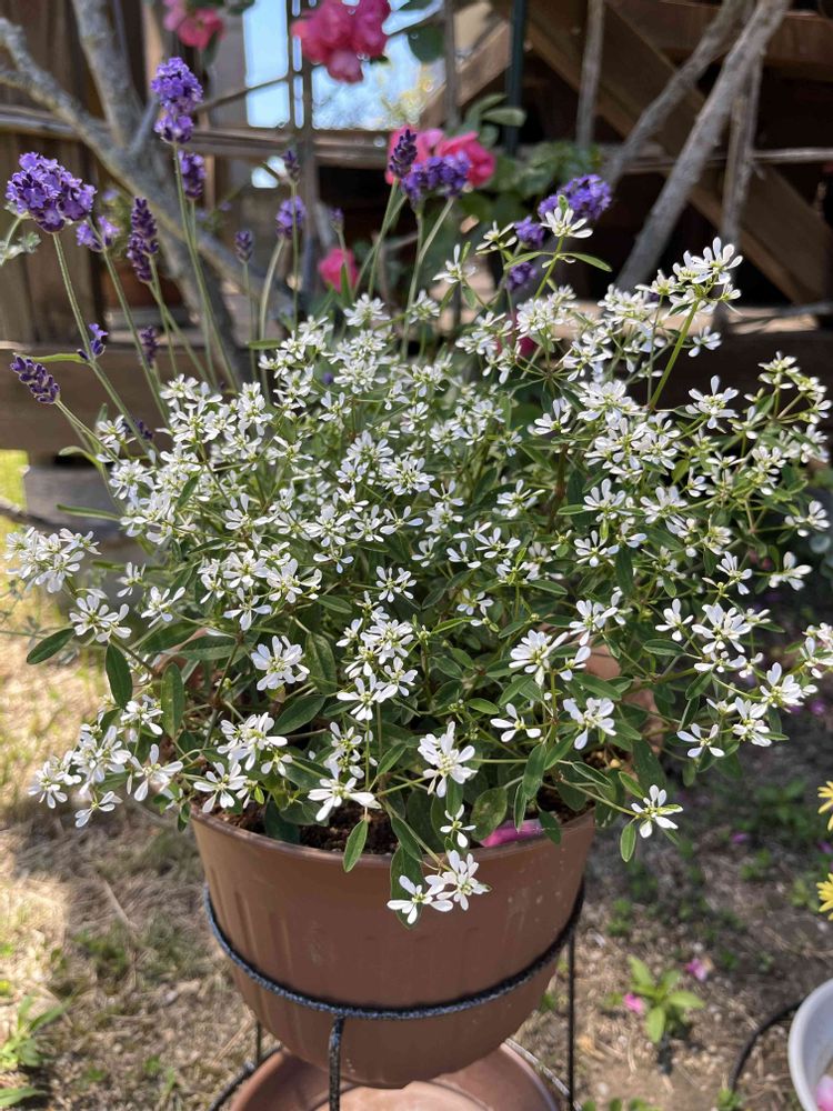⑤ユーフォルビアダイアモンドスノーの寄せ植え(イングリッシュラベンダーと)がずいぶんモリモリになってきました。