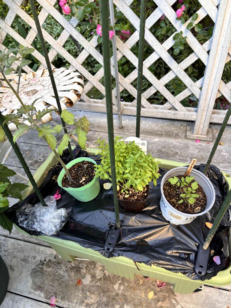 トッピングバジル、マイクロトマト、ミニトマトをひとつの菜園プランターで育てます。
