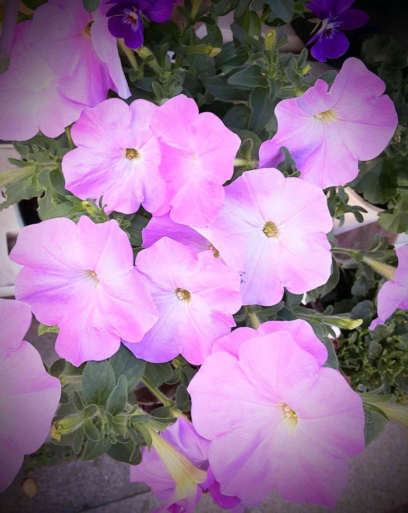 暑い日差しの中で羽衣のようなぺチュニアの薄紫の花が元気です✌️🌸