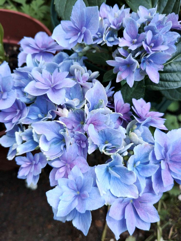 名前不明です。少し前に買ったのですが鉢植えのままのと切り花にしてた2枚目とが同じ紫陽花なのに随分違ってて面白いです。