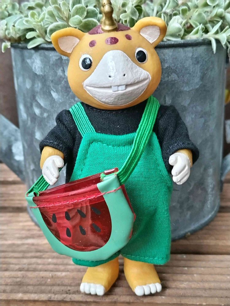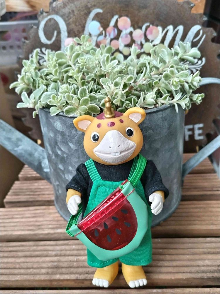 ④今日のブースカ…緑色のサロペットにスイカのバッグです🍉('-' 🍉 )スイカチャン