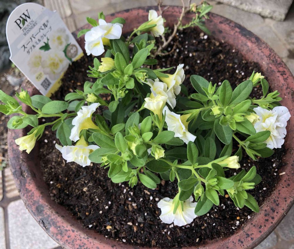 ペチュニアやカリブラコアは、水遣りでダメにしてしまいがちで苦手意識がありますが、かわいいダブルミルクレープをPWガーデンストアから我が家へ