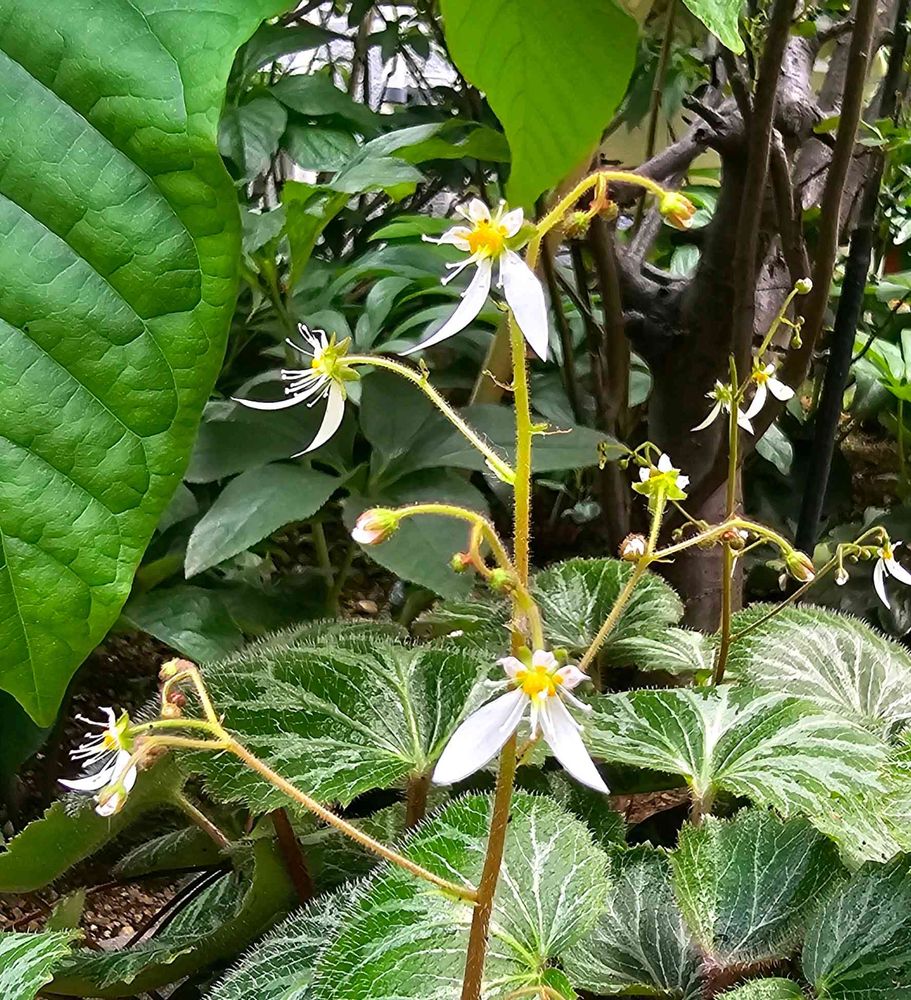 半日陰の少し湿った環境が好きな 楚々とした花です。花茎を立ち上げて白い花をつけ 花はダイモンジソウに似ていますね。しなやかな葉は 脈に沿って縞模様の斑が入った丸い形をしています。