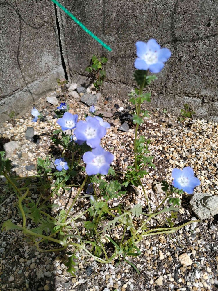 ③こぼれ種咲きのネモフィラ、ヒョロヒョロだけど長期間咲いてます。