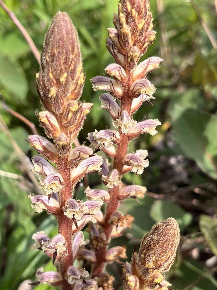緑の草の中からニョキッと出た緑を持たない不思議な草 紫蘇の花の様な歌穂 アカツメクサやシロツメクサなどに寄生する帰化植物 近くにアカツメクサが有りました