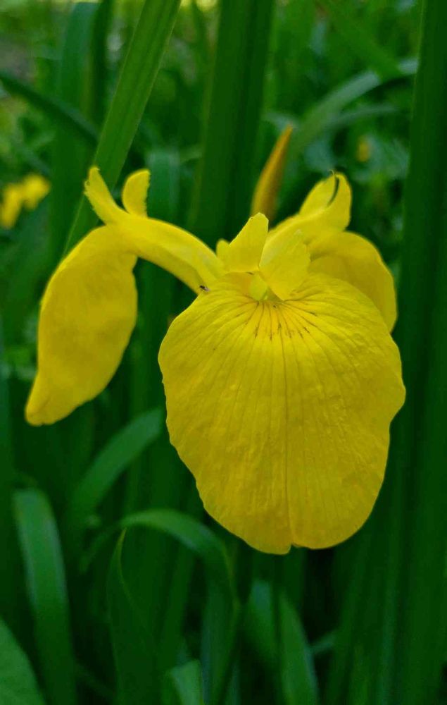 アヤメ科アヤメ属の多年草。ヨーロッパから西アジアにかけての原産で、明治時代末期に花卉として導入され、日本産の花菖蒲(ハナショウブ)にはない純黄色の花が好まれ、また、強健なことから全国各地で栽培され、湖・川岸などで逸出、野生化している帰化植物。地下に横走する太い根茎をのばし、長さ1.5mほどの濃緑色、無毛で線形の葉を多数そう生する。花期は5~6月。葉とほぼ同高花茎を出し、よく分岐して先端に数個の黄色の花をつける。花は直径約8㎝、外花被片は大きく開出し、内花被片は小さくて直立する。花期は5~6月。花後に三角柱形の果実。咲いた花全部が結実するのではないかと思えるほど、沢山の果実がなる。果実は三角状の楕円形で中に種がぎっしりとつまっている。熟すと3つに裂ける。