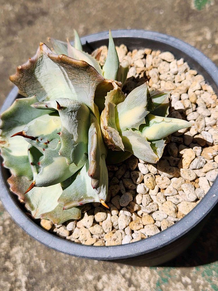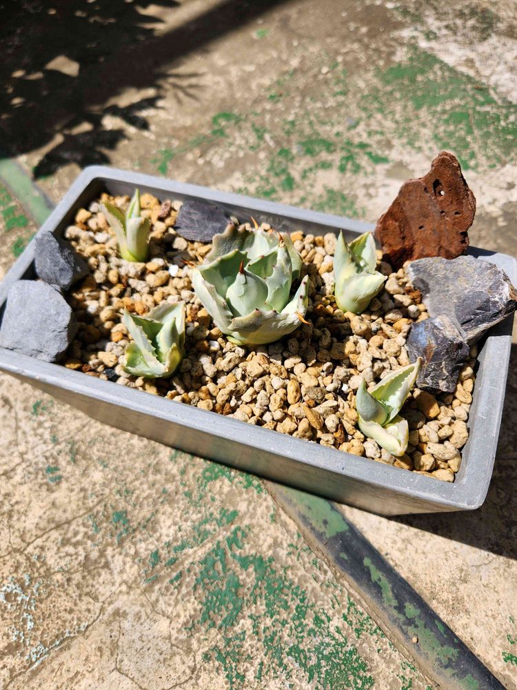 春先に植え替えた王妃雷神錦、どうにも調子が悪い😅もう子株いっぱいなので鉢増やしたくないので群生のまま植え替えたんですがヤバそうなので苦肉の策でなんちゃってミニチュアロックガーデン風に株分け🫠こんなことしてる人見たことないけど吉と出るか?