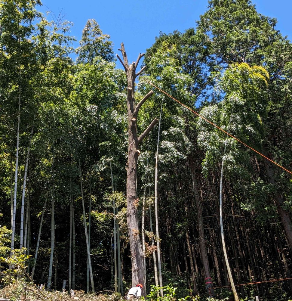 山の上や、我が家の山の真ん中ならいいのですが、斜面の下に隣家の建物が立ち、将来大変困ると予想されるので、ボランティアの方がやってくださるこの機会に伐採をお願いしました。