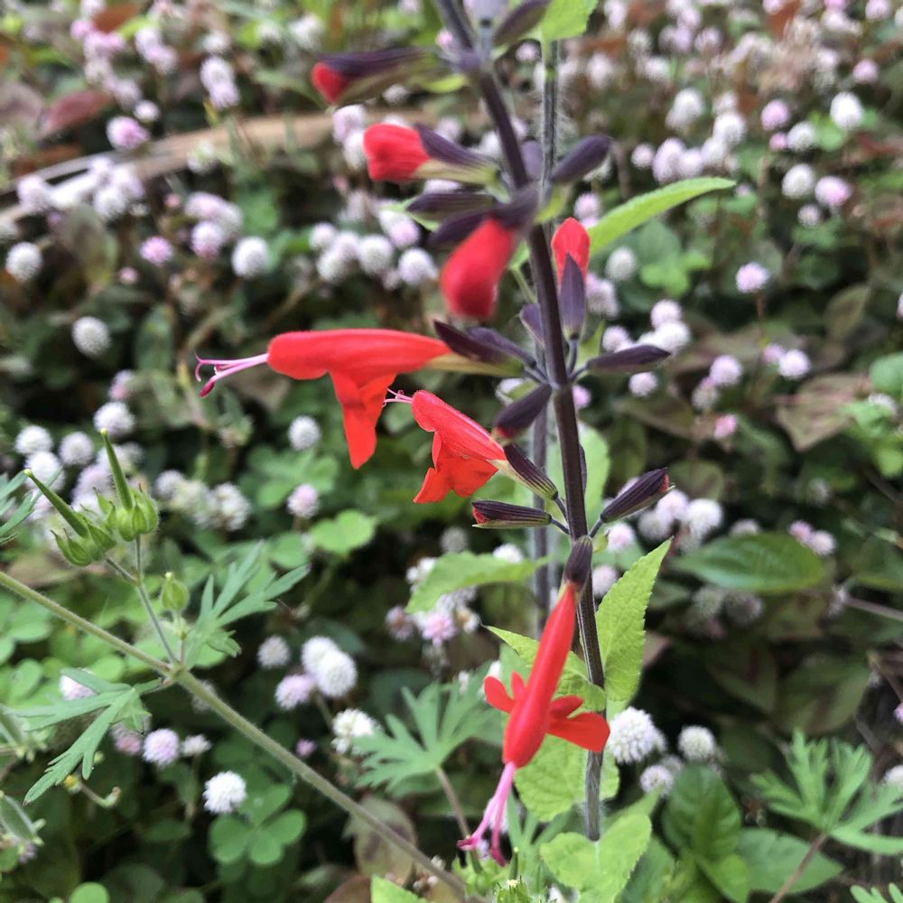 冬の間にいつの間にか姿が見えなくなってた4〜5年めくらいのサルビアコクシネア。過去をリセットして1から出直し、みたいな感じで成長、咲き始め。